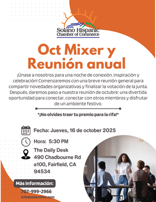 ¡Únase a nosotros para una noche de conexión, inspiración y celebración! Comenzaremos con una breve reunión general para compartir novedades organizativas y finalizar la votación de la junta. Después, daremos paso a nuestra Reunión de Octubre: una divertida oportunidad para conectar, conectar con otros miembros y disfrutar de un ambiente festivo.